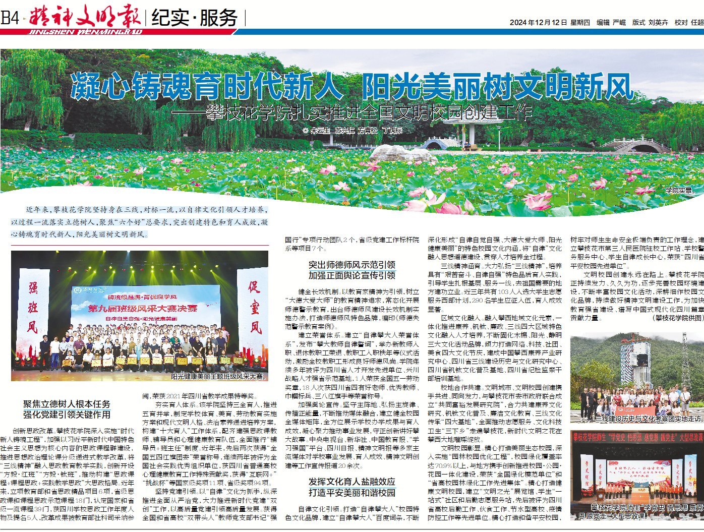 12月12日,精神文明报以“凝心铸魂育时代新人阳光美丽树文明新风”为题,重点围绕学校以自律文化引领人才培养,以过程一流落实立德树人,聚焦“六个好”总要求,突出创建特色和育人成效,扎实推进全国文明校园创建工作进行了报道。