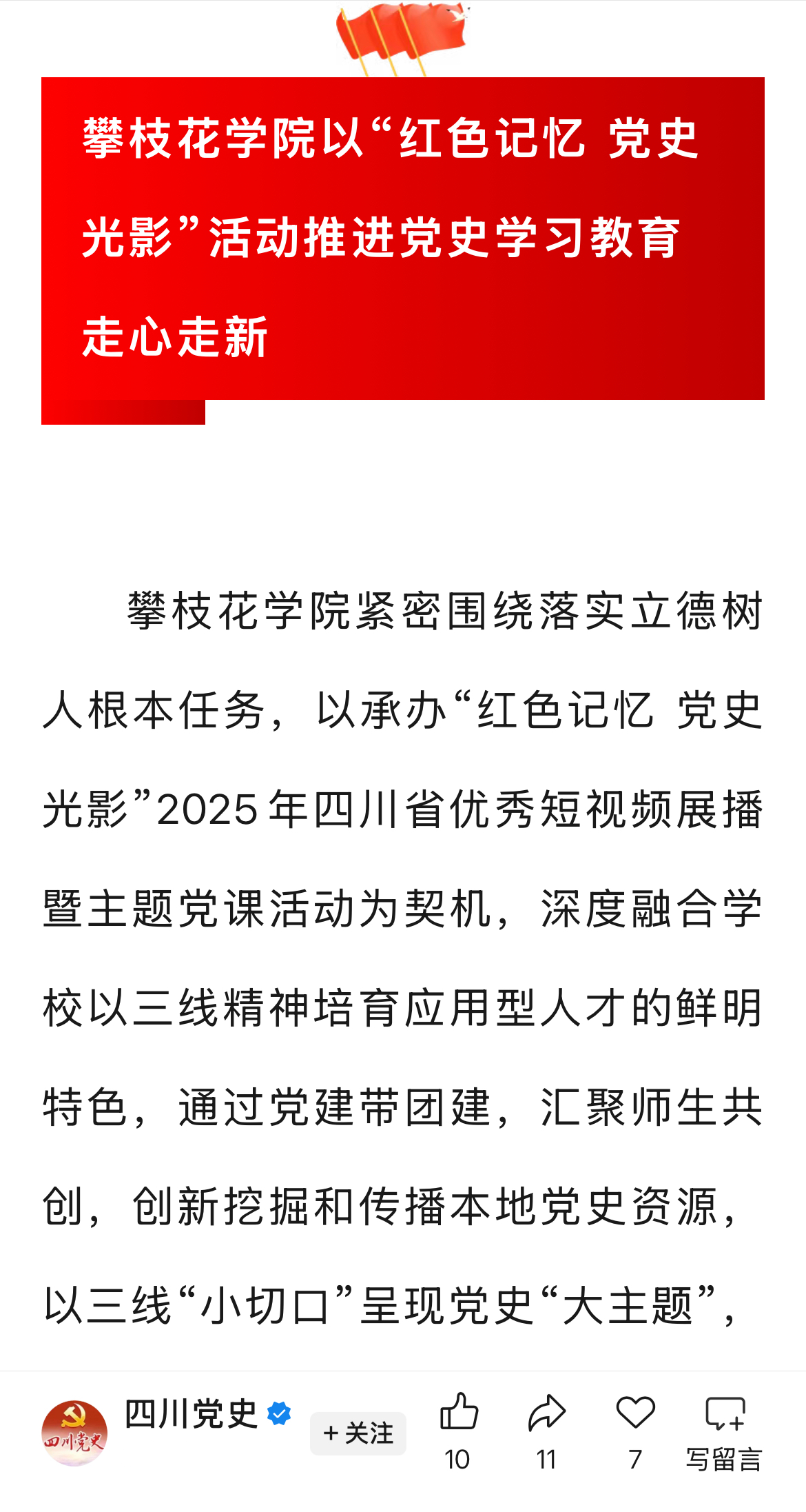 近日,四川党史文献网及四川党史微信公众号以《下载香港宝典2021以“红色记忆党史光影”活动推进党史学习教育走心走新》为题报道我校以承办“红色记忆 党史光影”2025年四川省优秀短视频展播暨主题党课活动为契机,深度融合学校以三线精神培育应用型人才的鲜明特色,通过党建带团建,汇聚师生共创,创新挖掘和传播本地党史资源,以三线“小切口”呈现党史“大主题”,让党史教育走进课堂、融进专业、落到师生,推进党史学习教育走心走新。